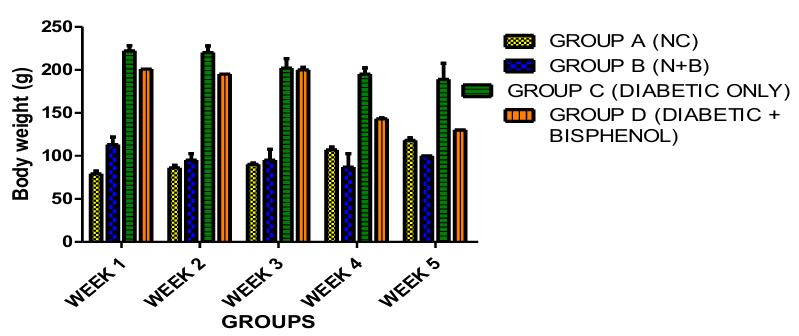 Polycarbonate plastics, widely used in consumer products, contains bisphenol A (BPA), a compound with endocrine-disrupting properties. BPA exposure has been implicated in exacerbating metabolic disorders, including diabetes. Understanding its histological impact on diabetic patients is critical, as chronic exposure may amplify cellular damage. This study employs an animal model to investigate the effects of BPA on diabetic tissues, focusing on histological alterations. Thus, the aim of this research is to elucidate the potential risks of polycarbonate plastic exposure for diabetic individuals. A total number of Twenty male Wistar rats which average weight was 185g were used and randomly splitted into four groups with each group comprising of five rats. Group A served as the control group, Group B were induced with Bisphenol- A (100mg/kg), Group C were induced with STZ (100mg/kg) which served as diabetic group, Group D were induced with Bisphenol-A (100mg/kg) and STZ (100mg/kg) which served as diabetic and bisphenol group. Bisphenol administration was done orally and STZ administration done intraperitoneally. The findings of this study revealed the histological damage caused by bisphenol-A (BPA), highlighting the serious health risks it poses upon entering the body. Specifically, chronic BPA exposure in adult rats was shown to have observable adverse effects, including significant reproductive alterations that could potentially result in infertility. Additionally, BPA exposure led to a marked reduction in body weight and an increase in fasting blood glucose levels. Chronic exposure to bisphenol-A induces histological damage, reproductive alterations, body weight reduction, and elevated fasting blood glucose, posing significant health...